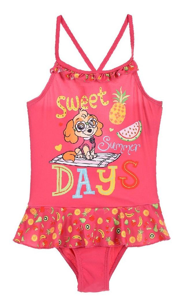 Krásné jednodílné plavky Tlapková Patrola v malinové barvě. Zdobené veselým volánkem.