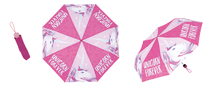 Skládací deštník Unicorn je standardní velikosti a doporučujeme jej spíše pro starší slečny. Deštník je velmi praktický, když jej potřebujete na cesty, snadno se umístí do kabelky, tašky do školy a děti jsou vždy připraveny na případné špatné počasí.